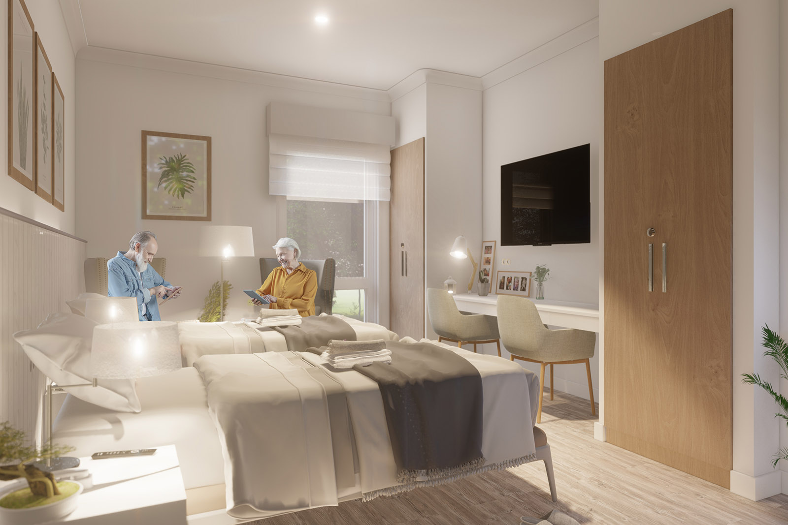 Habitaciones individuales y dobles con baño accesible, climaticación, suelo radiante, camas articuladas.